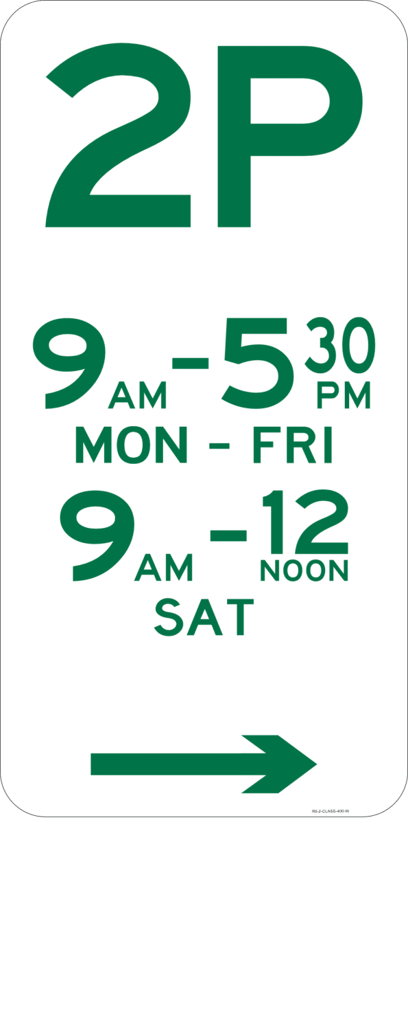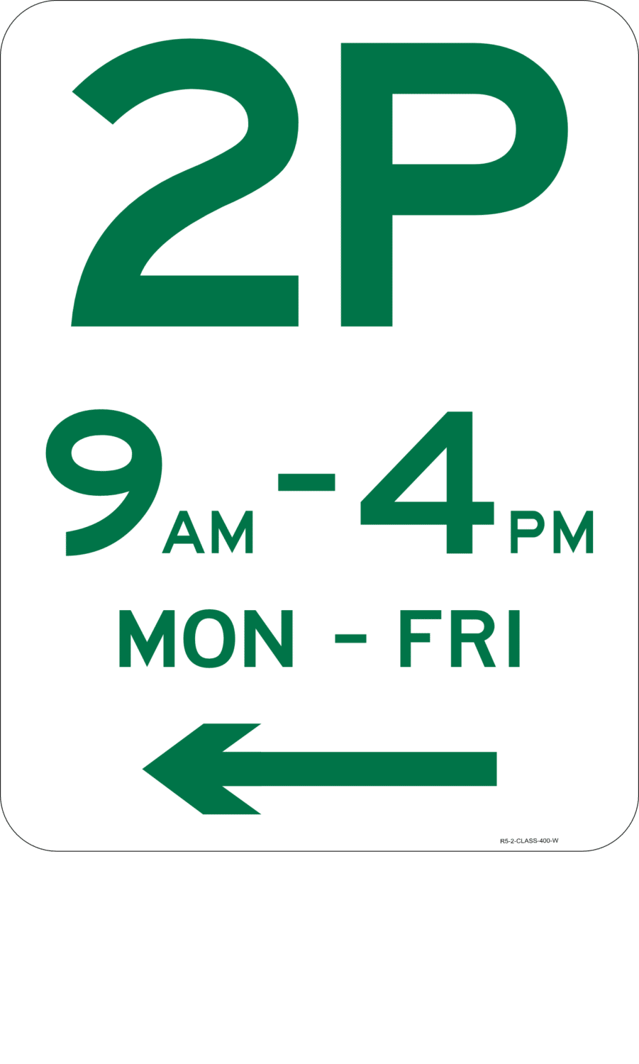 Parking 2 Hour available in Non Reflective and Class 1 reflective, with Over-laminate.